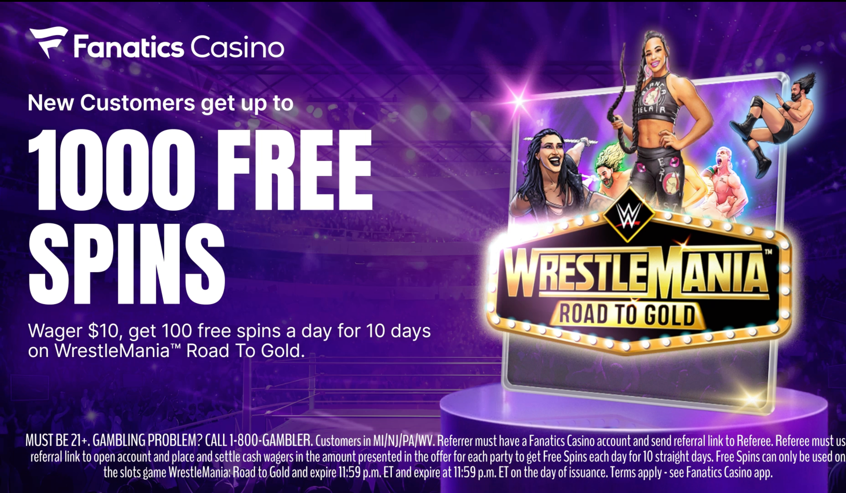 New customers physically present in PA/WV/NJ/MI. Must place $10+ in cumulative cash wagers on any Fanatics Casino games within 7 days of registering to receive 100 Spins each day for 10 straight days to use on the slots game Triple Cash Eruption. MUST OPT-IN EACH DAY TO CLAIM FREE SPINS. Free Spins expire at 11:59pm ET each day. See full Promo Terms in the Fanatics Sportsbook & Casino app.