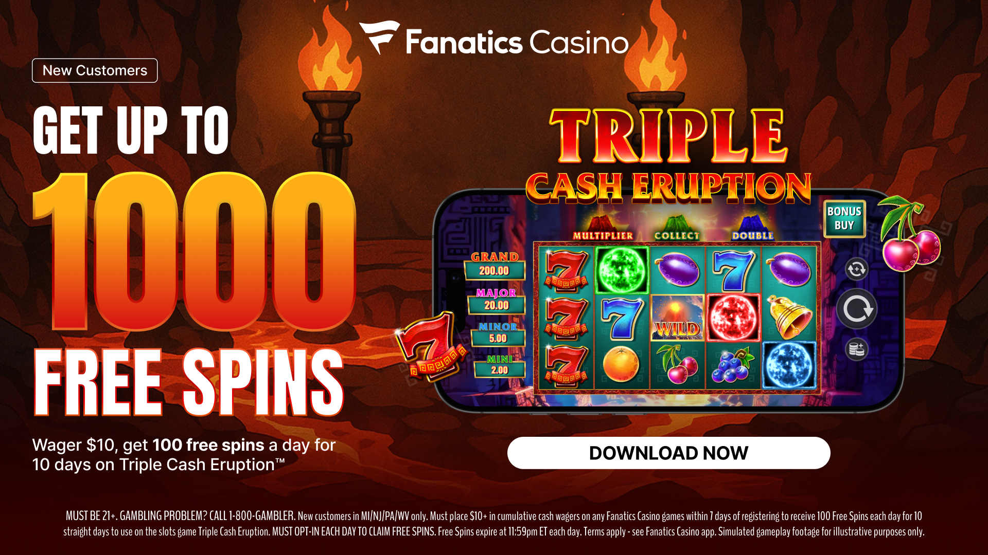 New customers physically present in PA/WV/NJ/MI. Must place $10+ in cumulative cash wagers on any Fanatics Casino games within 7 days of registering to receive 100 Spins each day for 10 straight days to use on the slots game Triple Cash Eruption. MUST OPT-IN EACH DAY TO CLAIM FREE SPINS. Free Spins expire at 11:59pm ET each day. See full Promo Terms in the Fanatics Sportsbook & Casino app.